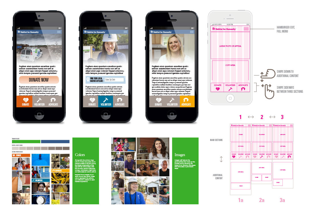 Concept diagrams and wireframes of a Habitat for Humanity mobile application (student project)