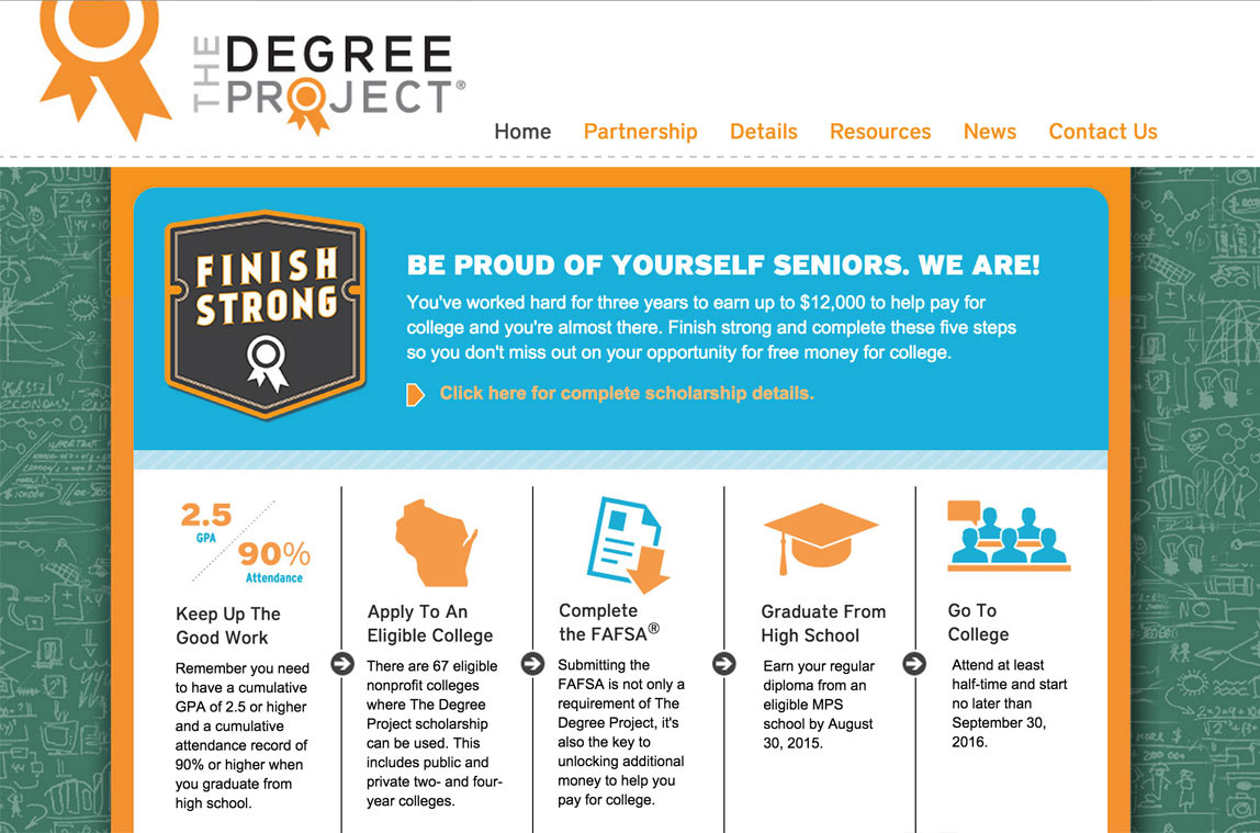As Art Director of Great Lakes, Stefan worked with design staff to extend a consistent look and feel across various print and online media for The Degree Project, an initiative to improve college readiness among students from disadvantaged backgrounds (Design by Katie Wing)