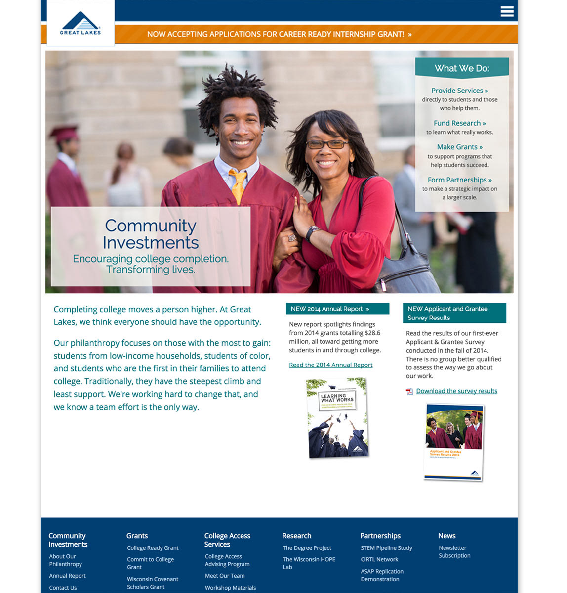 Stefan led an initiative to plan the refreshing of the Great Lakes brand, seen here after the completion of the project with its application to the primary website. Final design by Great Lakes Higher Education team.